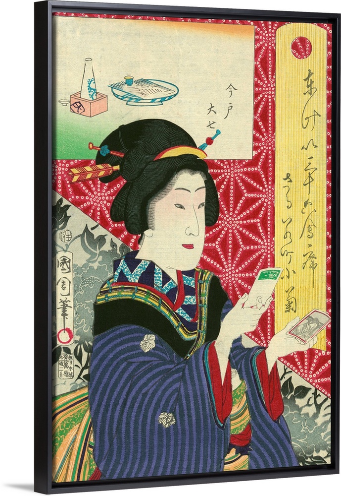 <p>Toyohara Kunichika (Japanese, 1835-1900), Kogiku in Saruwaka-Cho (Kogiku looking at early 'carte-de-visite' photographs of her admirers), 1878. Ukiyo-e woodcut print, vertical Oban format, 37 x 25 cm, private collection. Notes: The long, vertical cartouche on the right calls the woman Kogiku, which translates as small chrysanthemum, and gives the address in Saruwaka-Cho (now Asakusa), an entertainment district in Japan's capital city of Edo, now Tokyo. The stamp on the carte de visite represents the noted Tokyo portrait photographer Uchida Kuichi, who had a studio in Asakusa. The sake and grilled fish in the rectangle above the woman's head show the culinary specialties of the restaurant in which she is standing.</p>