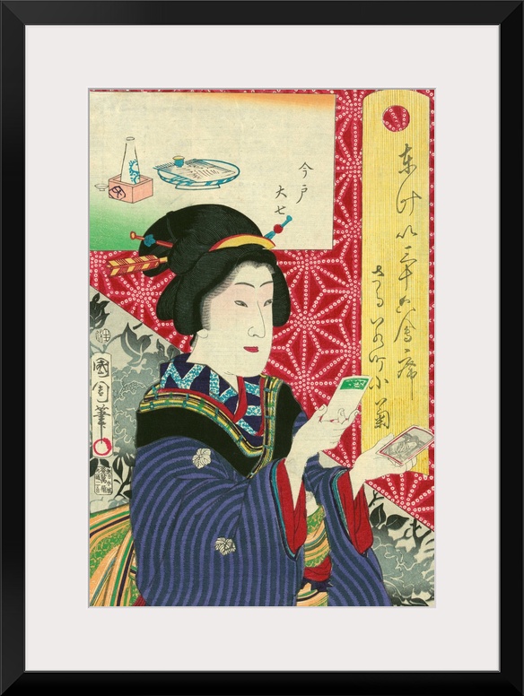 <p>Toyohara Kunichika (Japanese, 1835-1900), Kogiku in Saruwaka-Cho (Kogiku looking at early 'carte-de-visite' photographs of her admirers), 1878. Ukiyo-e woodcut print, vertical Oban format, 37 x 25 cm, private collection. Notes: The long, vertical cartouche on the right calls the woman Kogiku, which translates as small chrysanthemum, and gives the address in Saruwaka-Cho (now Asakusa), an entertainment district in Japan's capital city of Edo, now Tokyo. The stamp on the carte de visite represents the noted Tokyo portrait photographer Uchida Kuichi, who had a studio in Asakusa. The sake and grilled fish in the rectangle above the woman's head show the culinary specialties of the restaurant in which she is standing.</p>