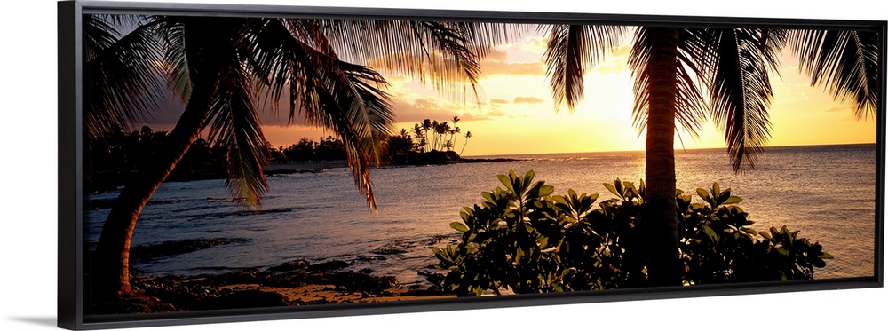<p>Panoramic wall art photo for the office or home of the Hawaiian coast; palm trees grow along the shore and the sun sets over the ocean reflecting off the glittering water.</p>