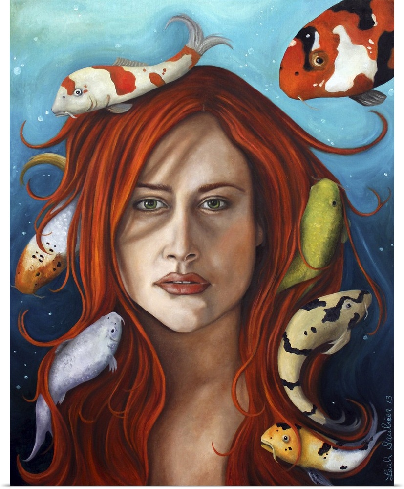 <p>Surrealist painting of a woman with red hair with koi swimming all around her.</p>
