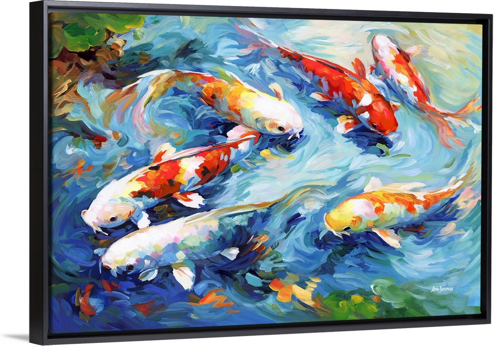 <p>This contemporary artwork beautifully captures a group of colorful koi fish gracefully gliding through water, with vibrant hues that create a serene atmosphere, perfect for enhancing any space with a touch of natural elegance.</p>