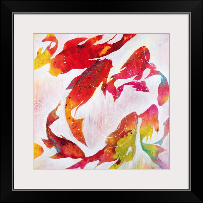 <p>Contemporary painting of colorful koi swimming in a pond.</p>