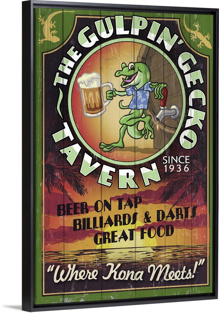 <p>Retro stylized art poster of sign for a beer, with an illustrated gecko holding a beer mug.</p>