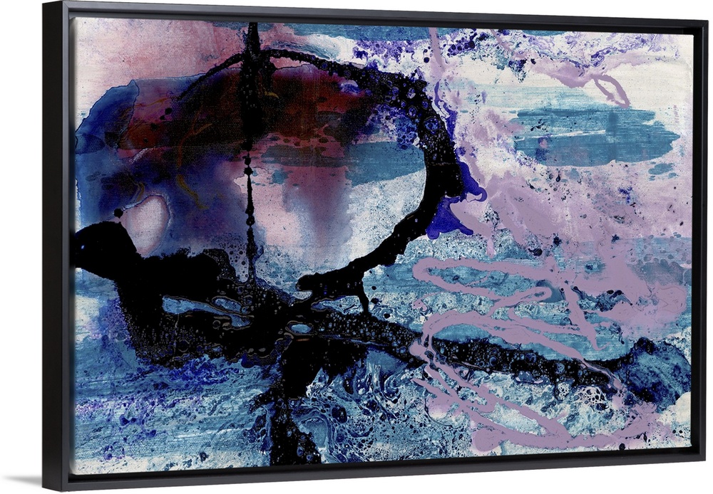 <p>A contemporary abstract painting of dark black and purple tones with splashes blue swirling around like smoke clouds.</p>