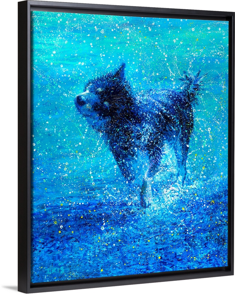 <p>Brightly colored contemporary artwork of a husky shaking water off.</p>
