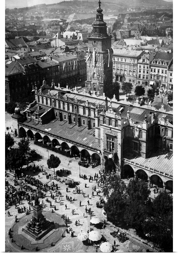 <p>A tower, which is all that remains of the 14th century town hall, overshadows the arcaded Cloth Hall (c), situated at the center of the large Rynek Glowny square.</p>