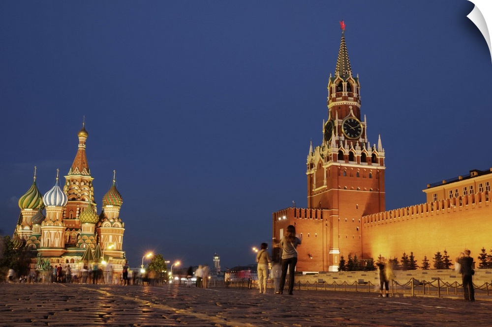 <p>Spasskaya tower of Moscow Kremlin and Saint Basil Cathedral at Red Square in Moscow. The Spasskaya Tower is the main tower with a through-passage on the eastern wall of the Moscow Kremlin, which overlooks the Red Square.</p>