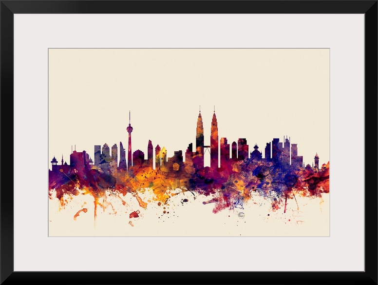 <p>Contemporary artwork of the Kuala Lumpur city skyline in watercolor paint splashes.</p>