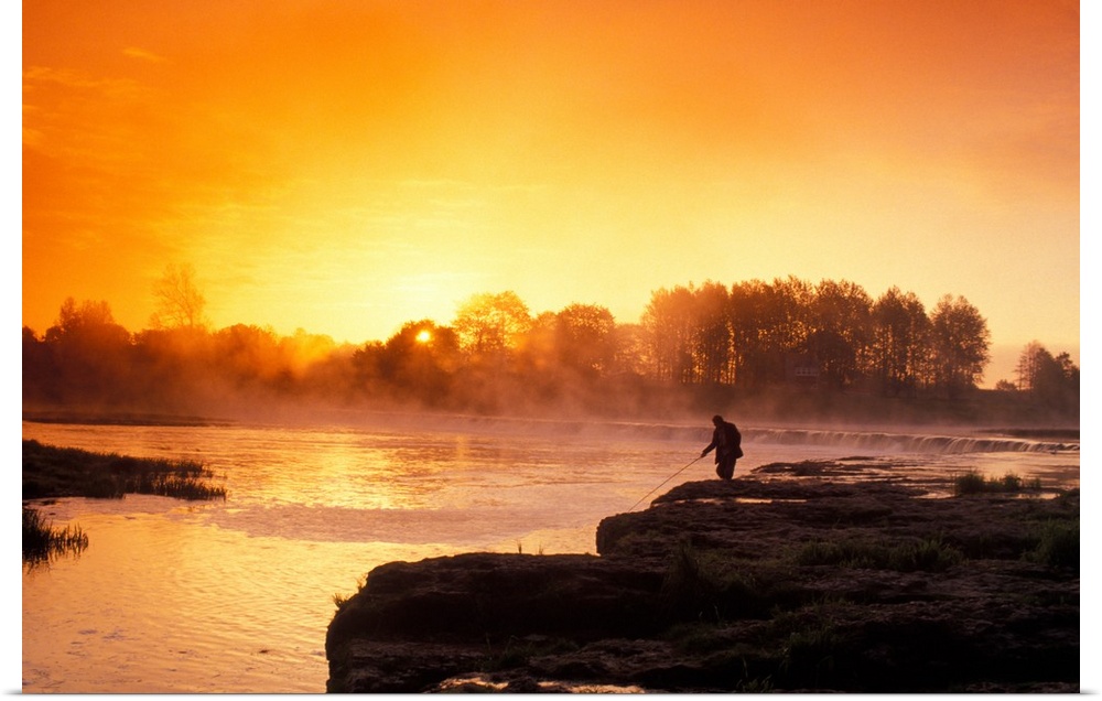 <p>Fisherman at sunrise on Venta River waterfall at city of Kuldiga in Kurzeme region of Latvia.</p>