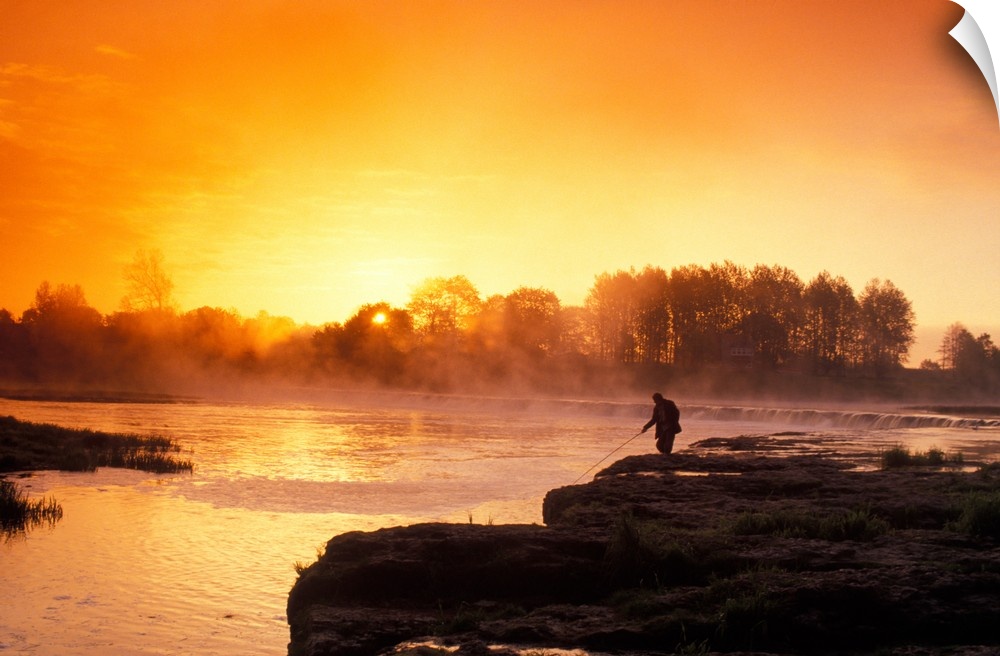 <p>Fisherman at sunrise on Venta River waterfall at city of Kuldiga in Kurzeme region of Latvia.</p>