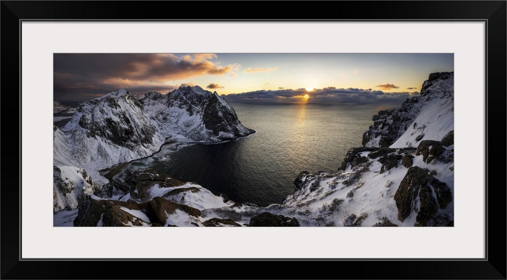 <p>Kvalvika coastline panorama and Ryten summit in winter sunset, Lofoten, Norway</p>