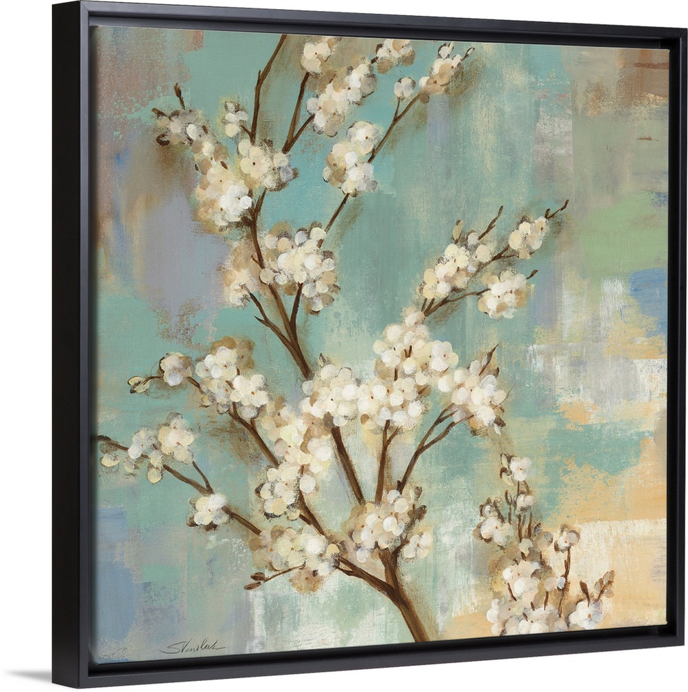 <p>Square painting on canvas of tree branches with blossoms on it against a pastel colored background with wide brush stroke textures.</p>