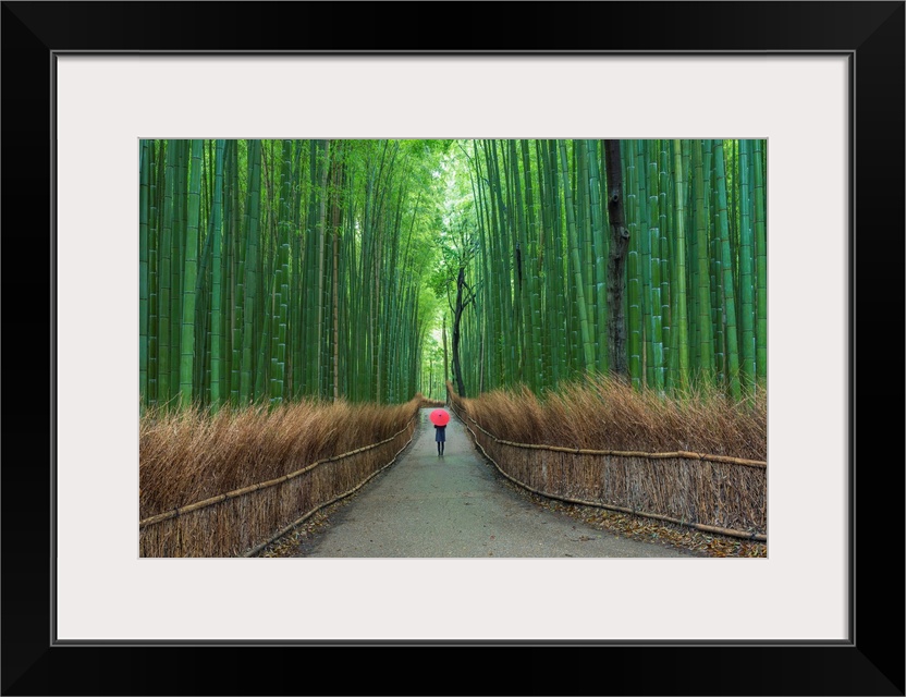 <p>Fine art photograph of a person walking on a path in a tall bamboo forest.</p>