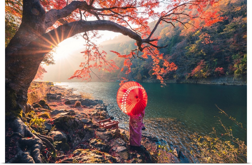 <p>Arashiyama, Kyoto, Kyoto prefecture, Kansai region, Japan. Woman with red umbrella and kimono admiring the view on Katsura river (MR).</p>