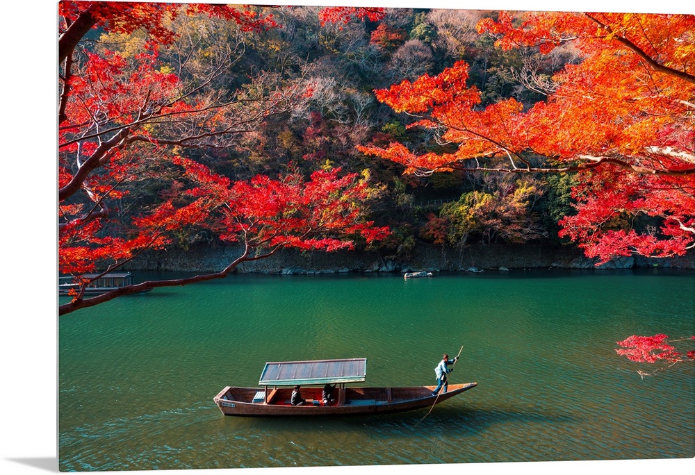 <p>Kyoto, Kyoto prefecture, Kansai region, Japan. Tour boats along the Katsura river in autumn.</p>
