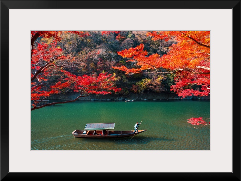 <p>Kyoto, Kyoto prefecture, Kansai region, Japan. Tour boats along the Katsura river in autumn.</p>
