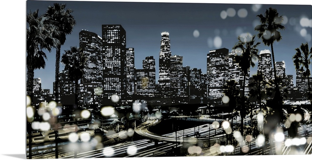 <p>Illustration of the Los Angeles skyline at night in black and white with a blue sky, palm trees in the foreground, and white bokeh lights.</p>