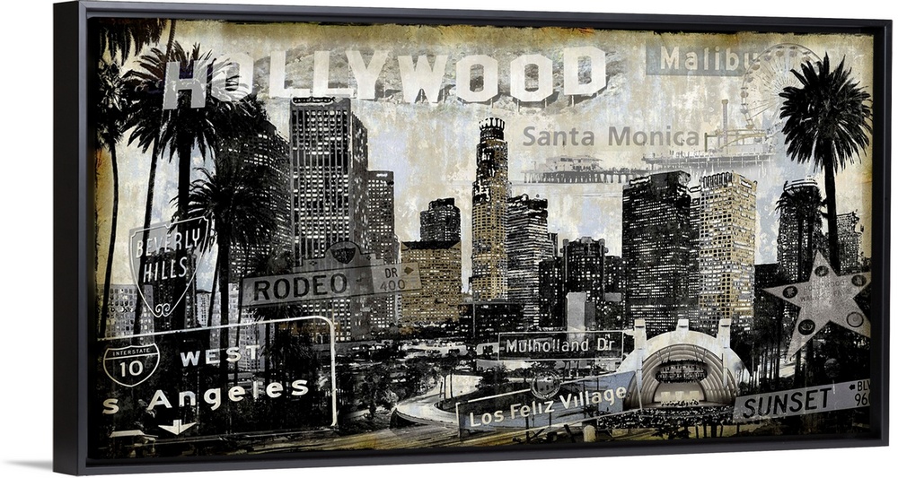 <p>Home decor with a cityscape of LA/Hollywood in black and sepia tones with well-known street signs and landmarks all over.</p>