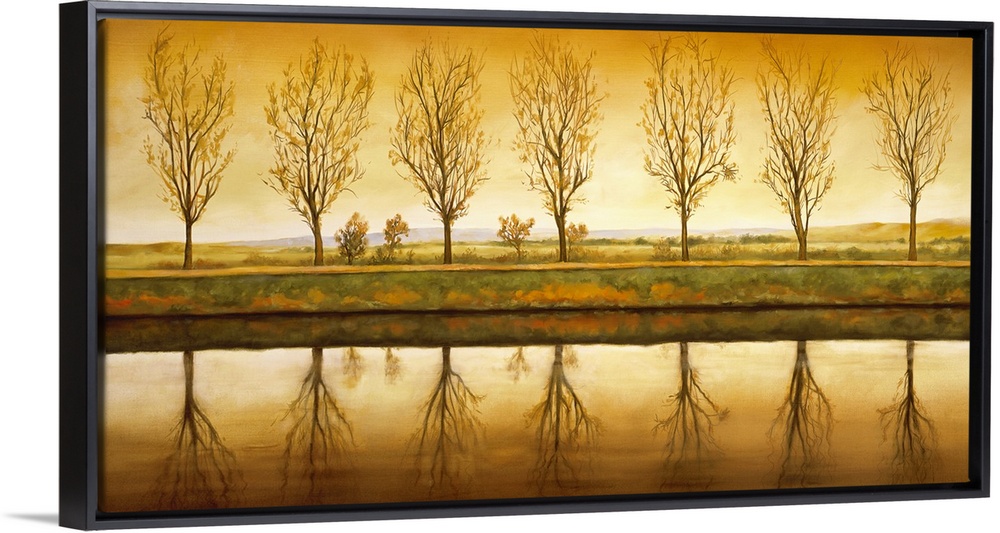 <p>Contemporary art on a landscape canvas of a line of seven trees with nearly bare branches, reflecting in the water in the foreground, beneath a golden sunset.</p>