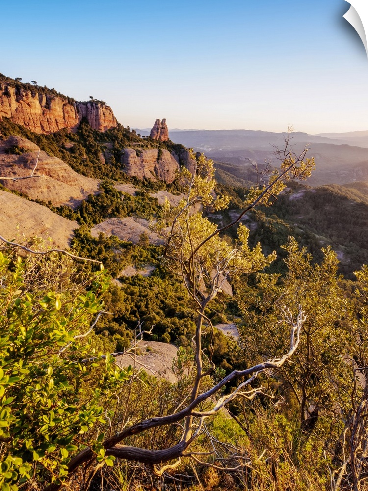 <p>La Castellassa de Can Torras and La Mola at sunrise, Sant Llorenc del Munt Natural Park, Matadepera, Catalonia, Spain, Europe</p>