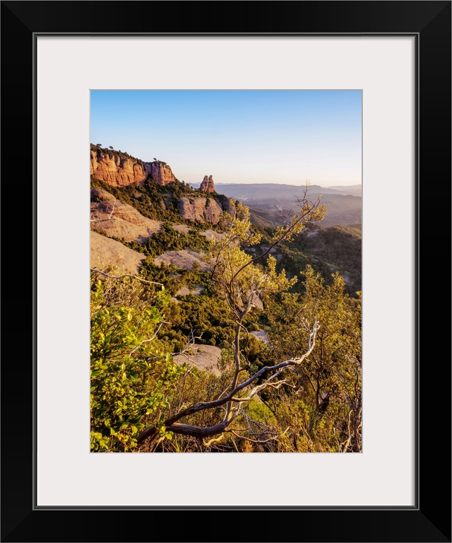 <p>La Castellassa de Can Torras and La Mola at sunrise, Sant Llorenc del Munt Natural Park, Matadepera, Catalonia, Spain, Europe</p>
