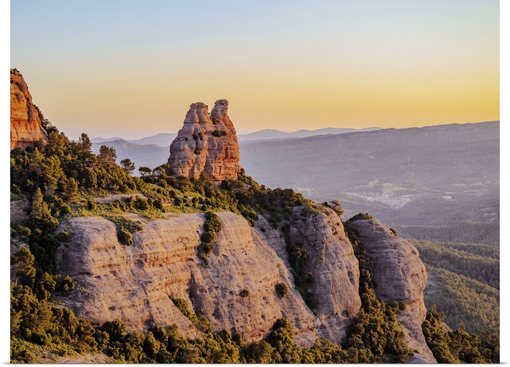 <p>La Castellassa de Can Torras and La Mola at sunrise, Sant Llorenc del Munt Natural Park, Matadepera, Catalonia, Spain, Europe</p>