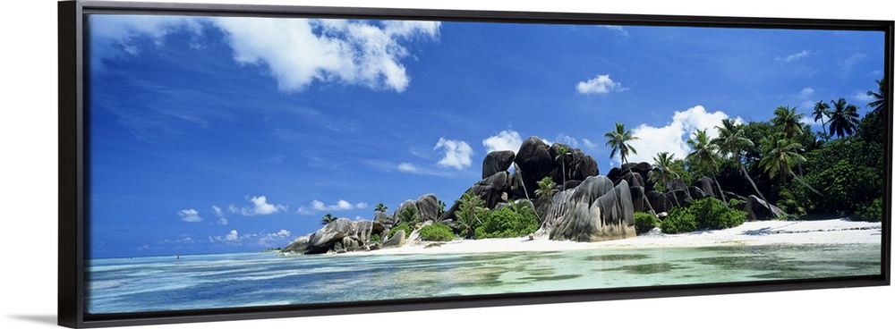 <p>A panoramic photograph of a tropical beach lined with large boulders and palm trees taken on a sunny day.</p>