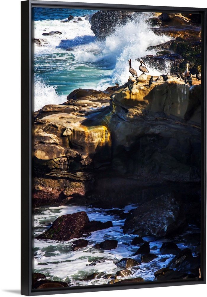 <p>Landscape photograph of rocky cliffs with pelicans on top watching the waves crash.</p>
