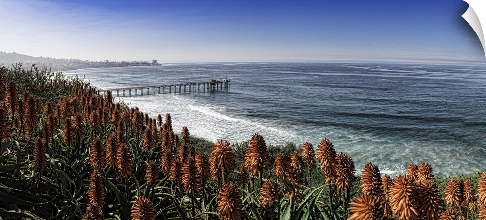 <p>La Jolla Scripps Pier and red aloe plants. This is a very large panoramic capture.</p>