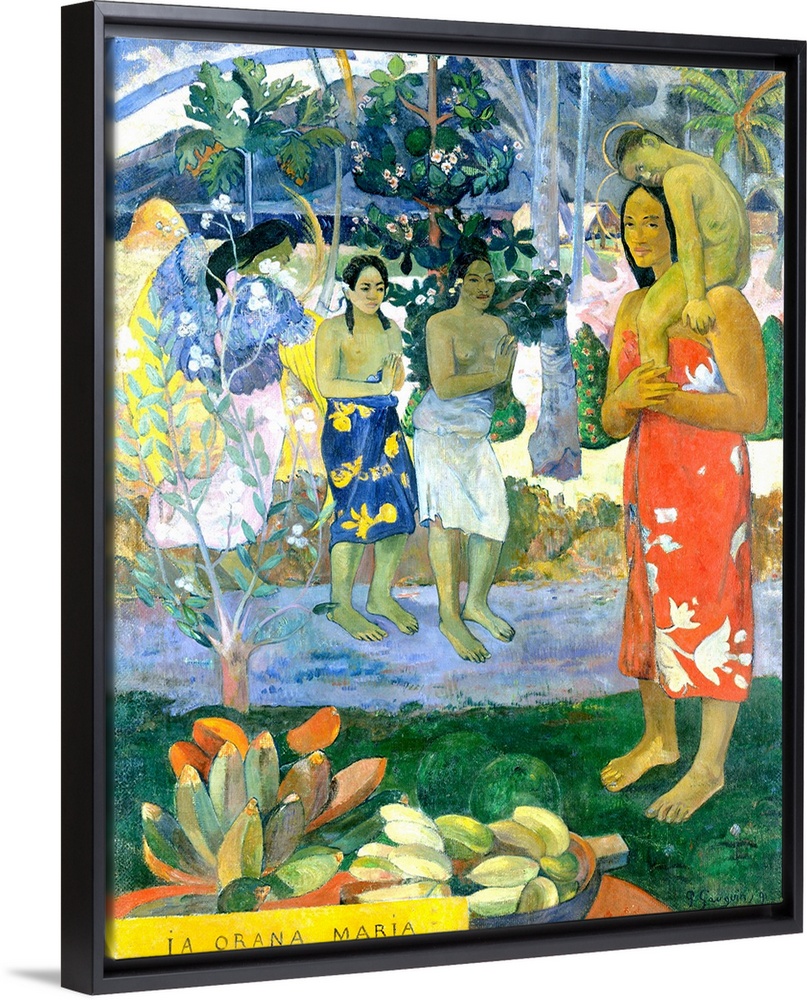 <p>Before embarking on a series of pictures inspired by Polynesian religious beliefs, Gauguin devoted this, his first major Tahitian canvas, to a Christian theme, describing it in a letter of March 1892: An angel with yellow wings reveals Mary and Jesus, both Tahitians, to two Tahitian women, nudes dressed in pareus, a sort of cotton cloth printed with flowers that can be draped from the waist. Very somber, mountainous background and flowering trees ... a dark violet path and an emerald green foreground, with bananas on the left. I'm rather happy with it. Gauguin based much of the composition on a photograph he owned of a bas-relief in the Javanese temple of Borobudur.</p>