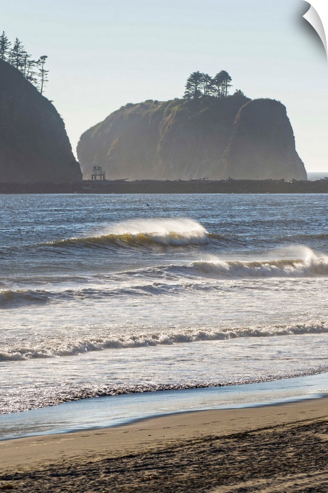 <p>Landscape photograph of waves crashing on the shore in La Push, Washington, with rocky cliffs in the background.</p>