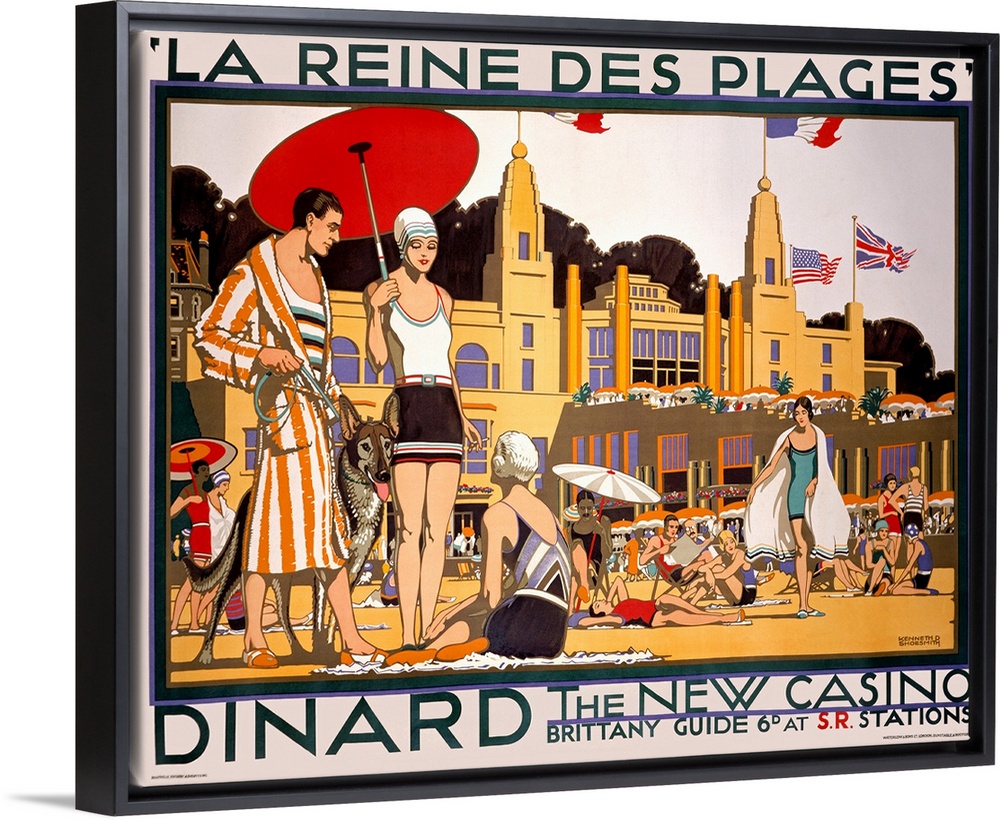 <p>Oversized, landscape vintage art advertisement of many people in swimwear with umbrellas, on a beach in Dinard in front of a casino. Text around image is partially French with some English.</p>
