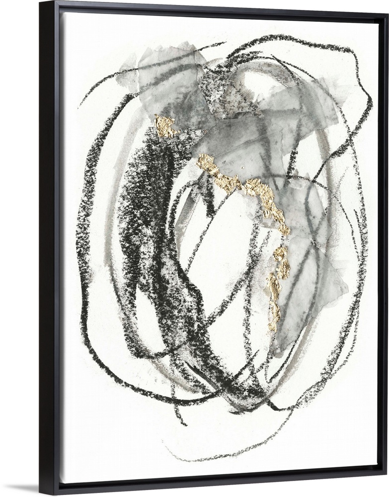 <p>Abstract painting of black scribbles and gray patches with gold leaf accents on a white background.</p>