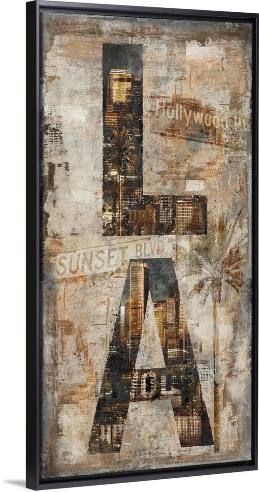 <p>Rustic sign with LA written vertically with the skyline in the letters and street signs and a palm tree surrounding the letters.</p>