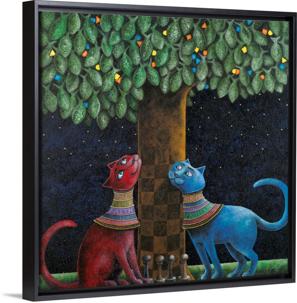 <p>Square illustration with two cats looking up a tree with a chess board marked trunk and chess pieces on the ground.</p>