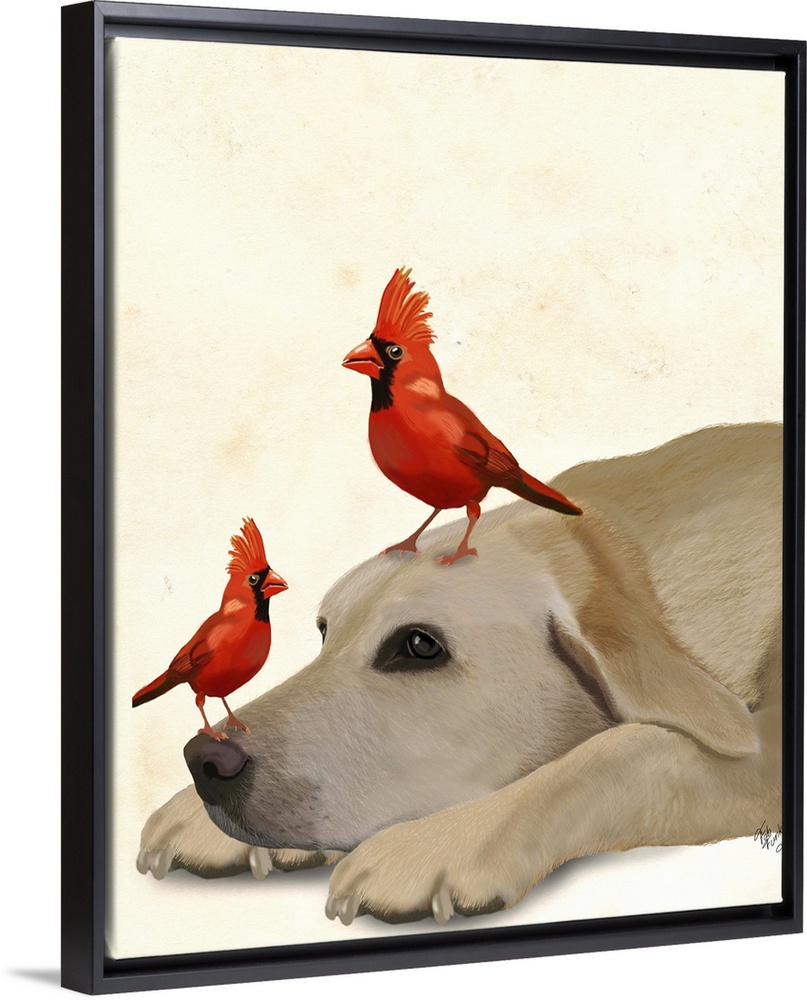 <p>A yellow lab laying on the floor with two cardinals.</p>