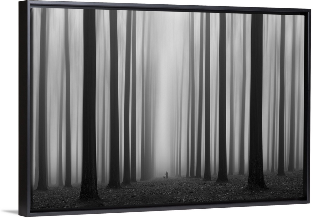 <p>A person and a dog in a misty forest of tall, dark trees.</p>