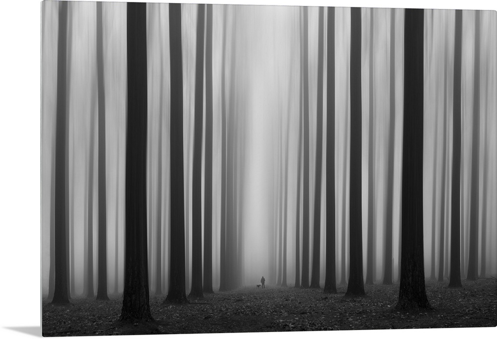 <p>A person and a dog in a misty forest of tall, dark trees.</p>
