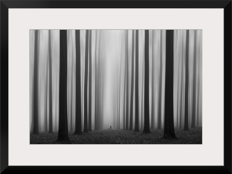 <p>A person and a dog in a misty forest of tall, dark trees.</p>