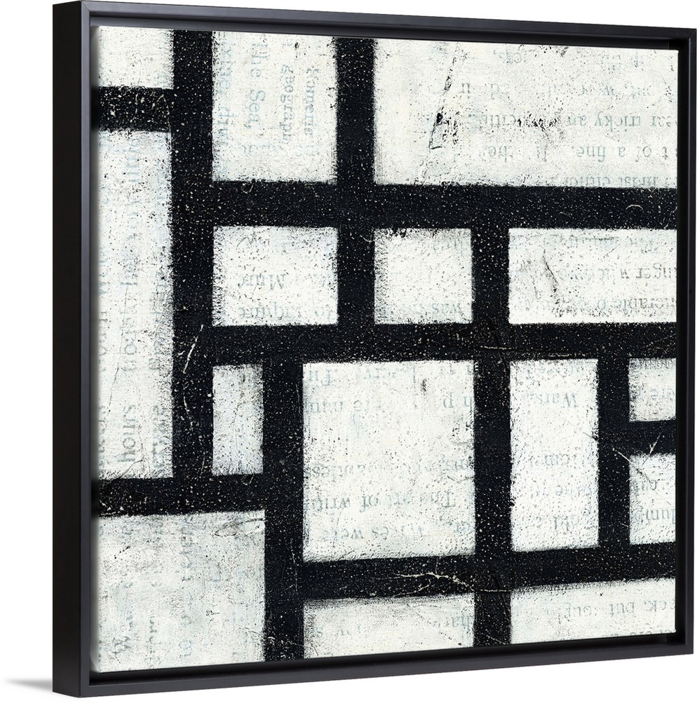 <p>Square contemporary painting of a black and white grid design with faded text peeping through the background.</p>