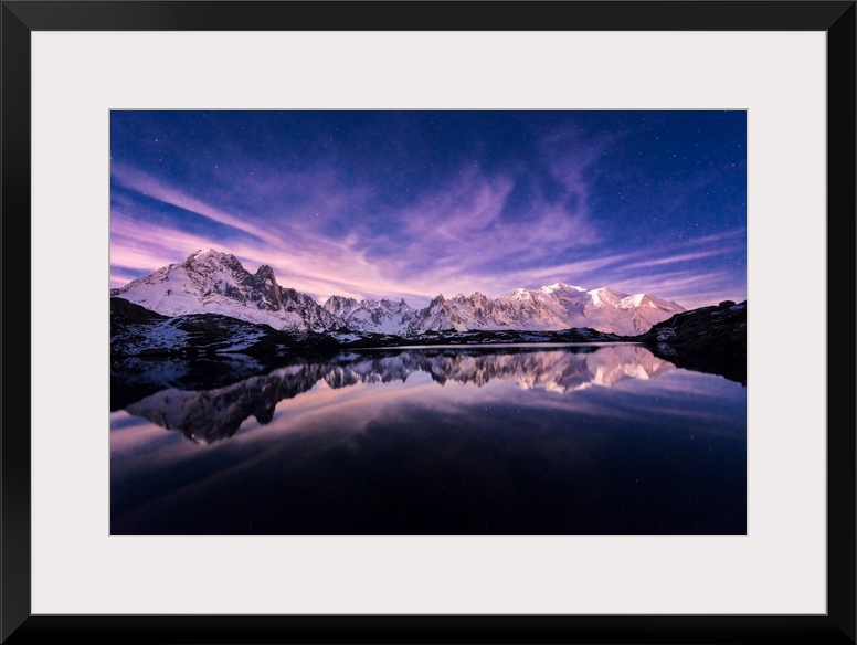 <p>Fine art photograph of a snowy mountain range reflected in the water under a lavender sky in France.</p>