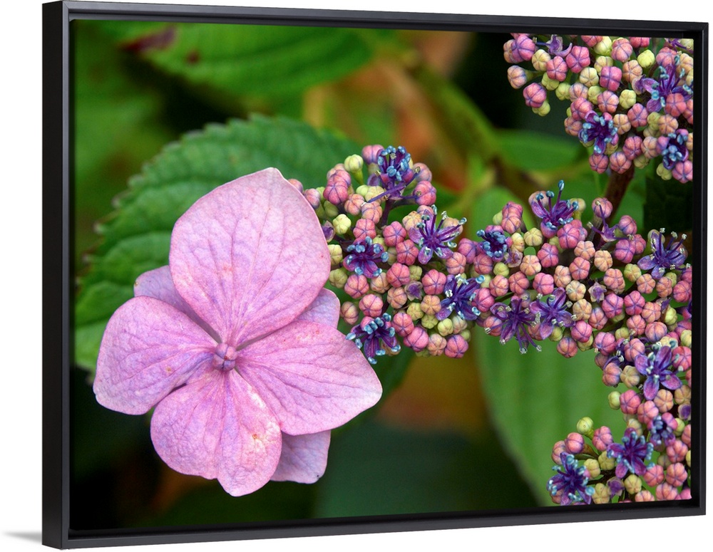 <p>Lacecap Hydrangea flowers. The larger flowers are sterile while the smaller flowers are fertile.</p>
