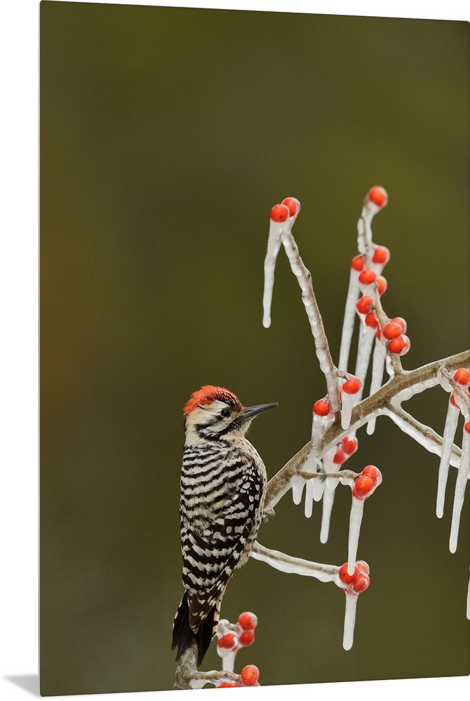 <p>Ladder-backed Woodpecker (Picoides scalaris), adult male perched on icy branch of Possum Haw Holly (Ilex decidua) with berries, Hill Country, Texas, USA</p>