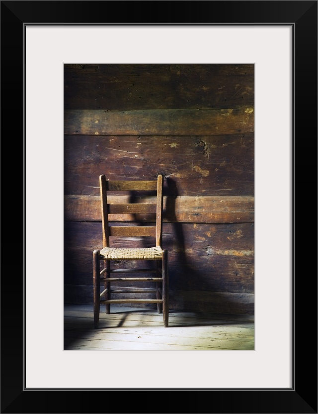 <p>Portrait photo of an empty ladderback wooden chair sitting in a beat up wood slat wall room with sanded down floors.</p>