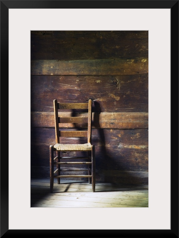 <p>Portrait photo of an empty ladderback wooden chair sitting in a beat up wood slat wall room with sanded down floors.</p>