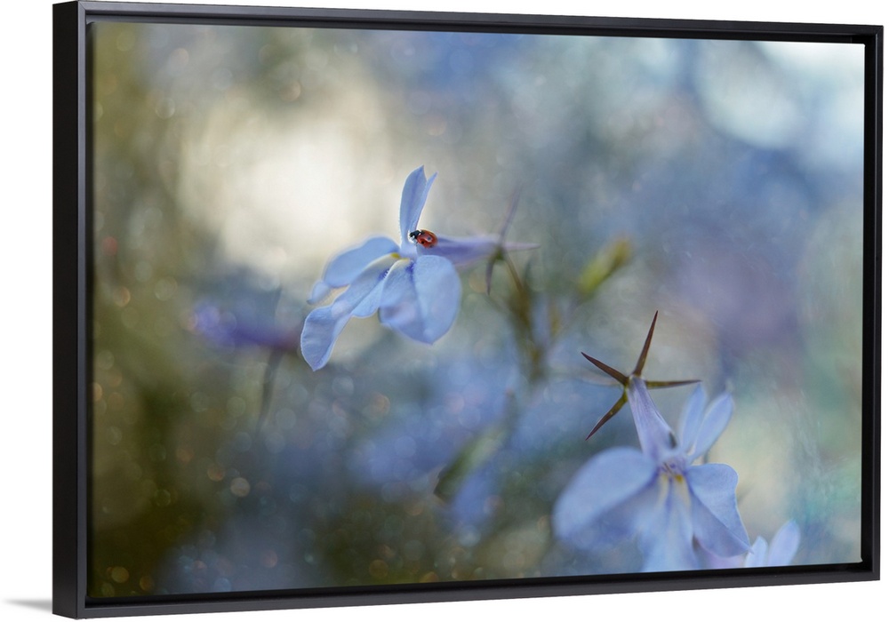 <p>Dreamlike photograph of a ladybug on a blue flower petal with a dreamy bokeh background.</p>