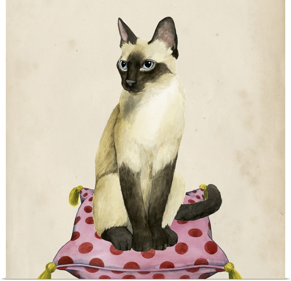 <p>Illustration of a Siamese cat sitting on a patterned pillow.</p>