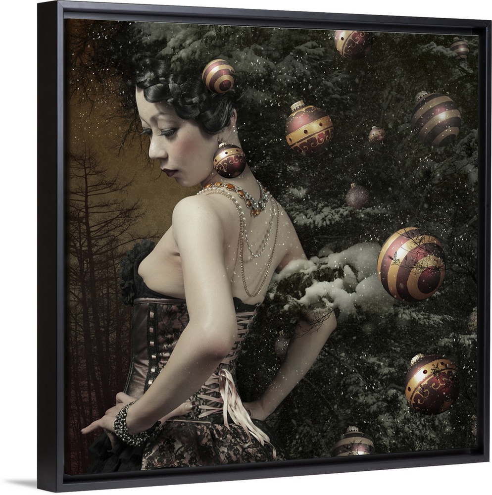 <p>A woman in a corset with a tree filled with ornaments.</p>