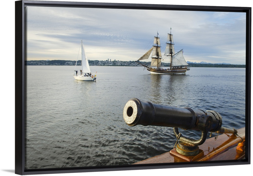 <p>Lady Washington sailing in Semiahmoo Bay, Washington State. A historic replica of the original 18th Century brig. Three pound gun swivel mounted gun on the Hawaiian Chieftain is in the foreground.</p>