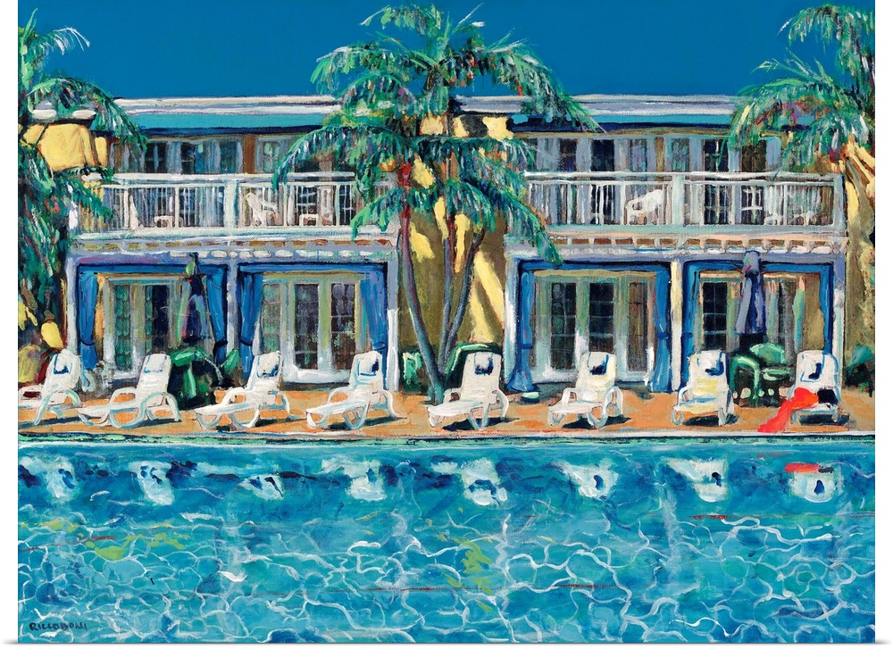 <p>Shimmering Poolside in courtyard at the historic Lafayette Hotel swimming pool in San Diego California, acrylic painting on canvas by RD Riccoboni. Yellow and blue colors contrast shimmer and sparkle at the retro and nostalgic site.</p>